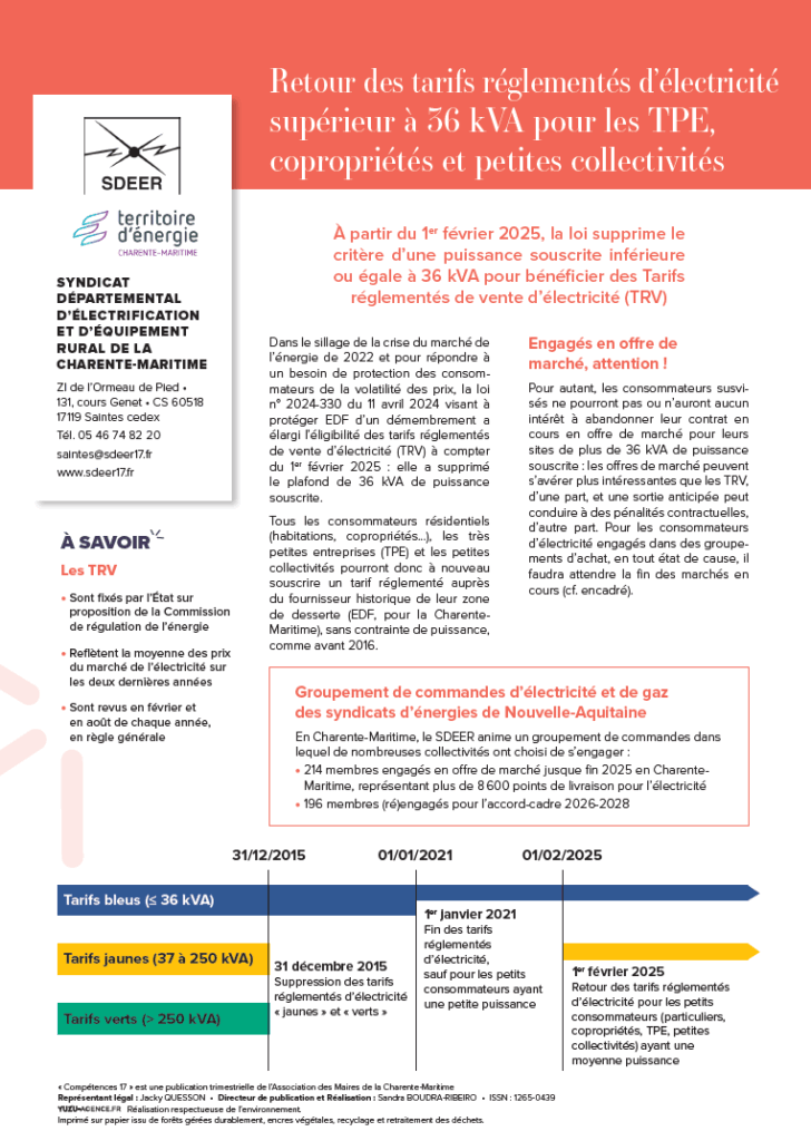 Chaque trimestre, le SDEER publie un article dans la publication trimestrielle Compétences 17, éditée par l’Association des Maires de la Charente-Maritime, et diffusée dans toutes les collectivités du département.