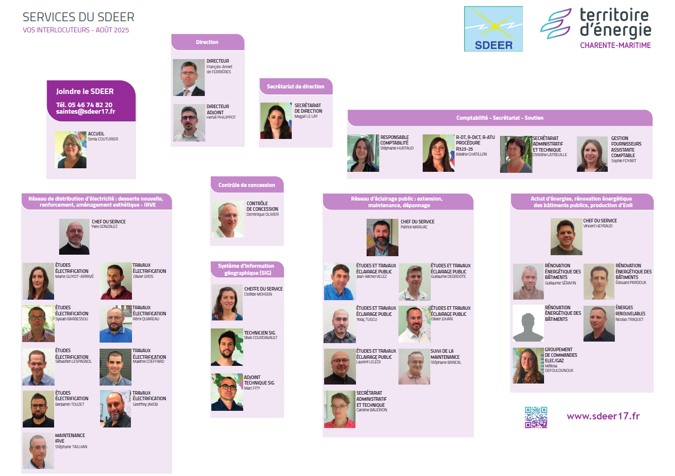 Les services du SDEER, installés au 131 cours Genet à Saintes, comptent 34 agents placés sous la responsabilité du Directeur.